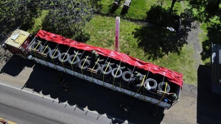 Al personal le llamó la atención que la carga no estaba distribuida de manera adecuada. Al subir para verificar hallaron precintados de neumáticos con la parte superior de las barandas.