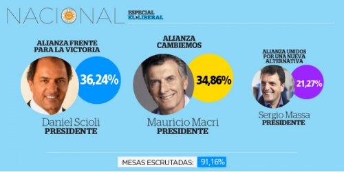 Aunque en las Primarias Abiertas, Simultáneas y Obligatorias (PASO) el actual gobernador bonaerense se había impuesto con comodidad y hasta había quedado al borde de poder evitar una segunda vuelta electoral, este domingo el saliente jefe de gobierno de la ciudad de Buenos Aires dio la sorpresa y con más del 80% de las mesas escrutadas Scioli se impone apenas con el 35,52% de los votos frente al 35,43% que cosecha Macri.