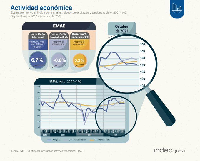 El Estimador Mensual de Actividad (EMAE) registró en octubre un crecimiento en términos interanuales de 6,7%, informó hoy el Instituto Nacional de Estadística y Censos (Indec).