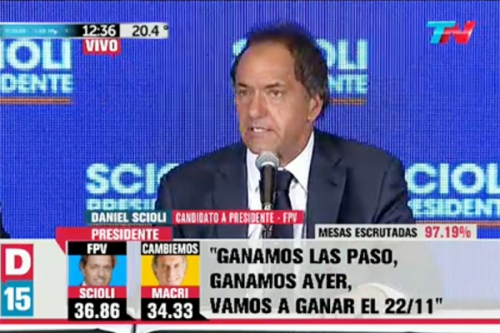 De acuerdo al escrutinio provisorio, Scioli fue el candidato a Presidente más votado en la provincia de Buenos Aires (37,13% a 32,92%) pese a que su candidato a gobernador, el jefe de Gabinete Aníbal Fernández, terminó cuatro puntos abajo de la ganadora, María Eugenia Vidal (39,49% a 35,18%).