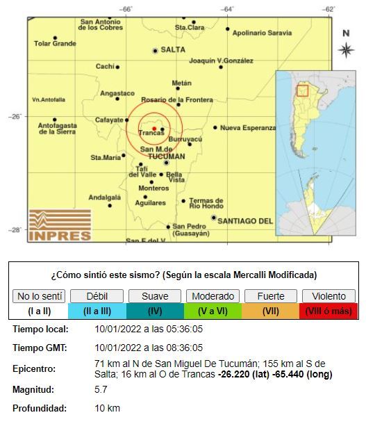 De acuerdo con los registros del Inpres, el movimiento telúrico se registró a las 5.36, tuvo una intensidad de 5.7, a 10 kilómetros de profundidad y su epicentro fue Tucumán.