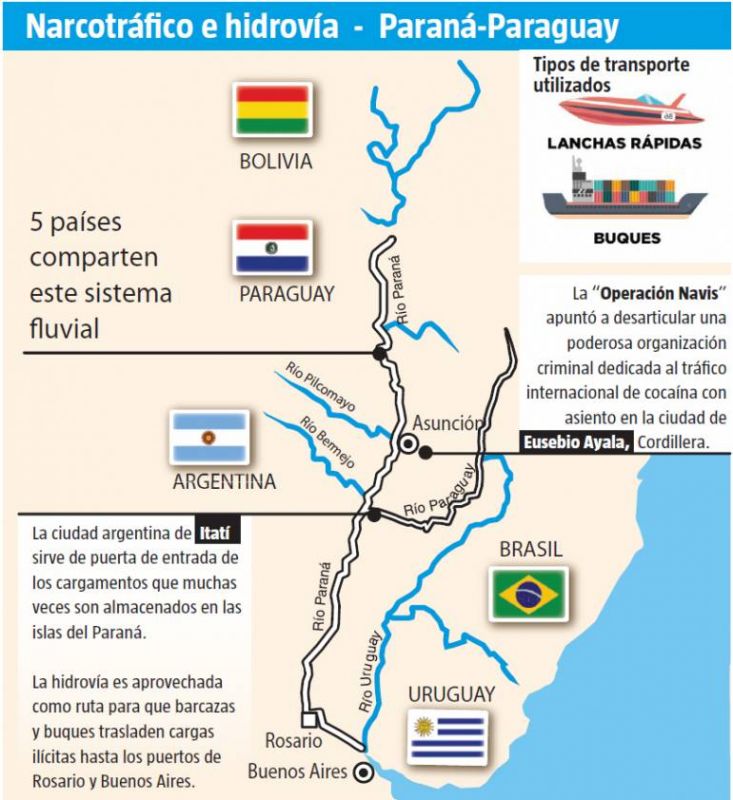 Las agencias gubernamentales creen hoy que la cocaína llega a Paraguay vía aérea para luego ser transportada por la hidrovía hasta los puertos de Rosario, Buenos Aires y Montevideo. Esto ocurre que los cargamentos sean detectados en territorio argentino, donde no hay controles de ningún tipo dado que se trata de exportaciones consolidadas en el exterior que están en tránsito.