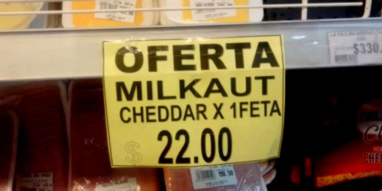 Y continuó: "Fuimos a carnicerías, verdulerías, pero esto es sorprendente: una persona vino a este supermercado de Pilar, que es bastante conocido porque tiene muchas ofertas, y se sorprendió por este cartel: ‘Queso cheddar x feta, 22 pesos’. Lo sube a las redes sociales, y esto se viralizó".