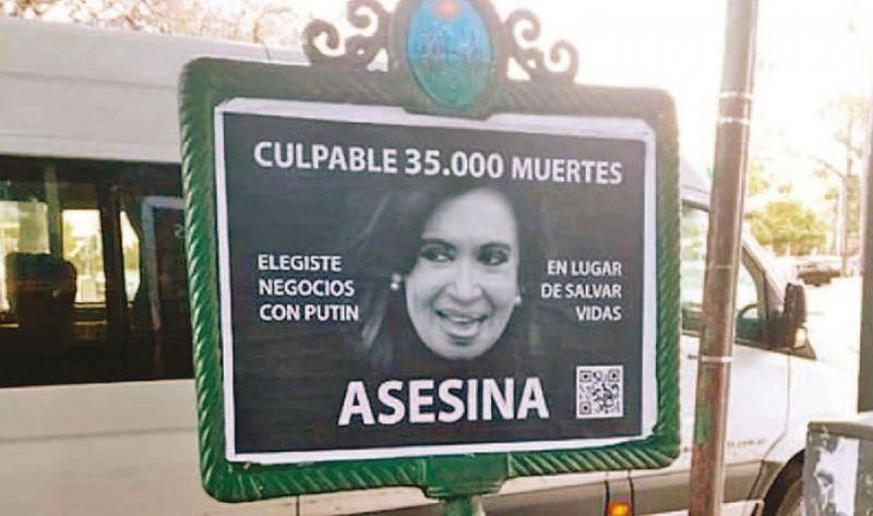 “Culpable de 35.000 muertes”, afirma el cartel con la imagen de la vicepresidenta en blanco y negro, y se estima que hace referencia al número de bajas producto a la invasión rusa en Ucrania. En el afiche figura también a la frase: “Elegiste negocios con Putin en lugar de salvar vidas”. Junto a la foto, se deja ver un código QR con un link bajo el título de “cfkladrona” que redirigía al sitio “cristinauta.org”. La URL fue dada de baja ayer durante las primeras horas.