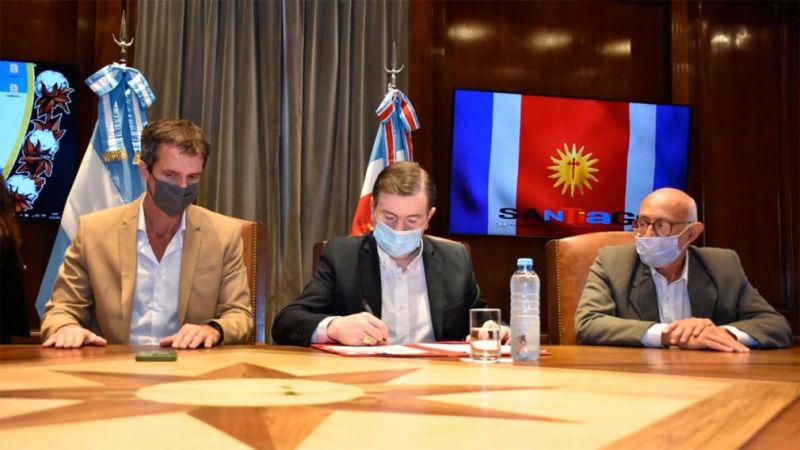 El gobernador Gerardo Zamora y el titular del Ente Nacional de Obras Hídricas de Saneamiento (Enohsa), Enrique Cresto, firmaron este martes un convenio de asistencia financiera para la ejecución de dos acueductos, el primero que beneficiará a los pobladores de Villa Mailín (Avellaneda), y segundo que se extenderá desde Pampa de los Guanacos (Copo) a Sachayoj (Alberdi).