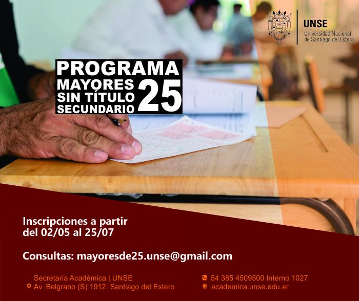 El período de inscripción comenzará el lunes 2 de mayo y se extenderá hasta el lunes 25 de julio del corriente año. Para más información, ingresa a www.academica.unse.edu.ar. Por correo electrónico: [email protected]