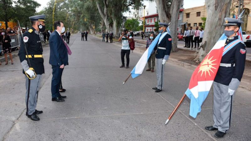 Como es costumbre en cada acto que se recuerda la Autonomía Provincial, el gobernador efectuó el saludo de estilo a las fuerzas de seguridad que forman parte de la ceremonia.