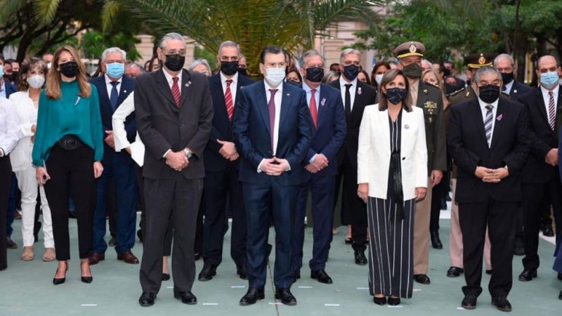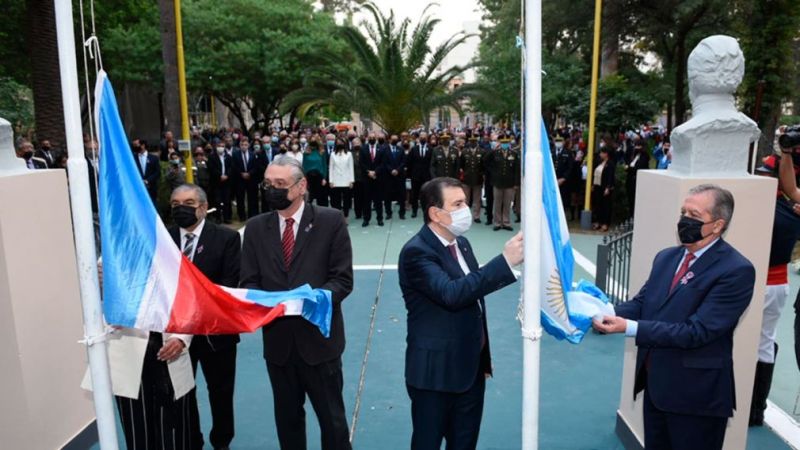 Junto a autoridades provinciales, municipales y judiciales, el primer mandatario provincial procedió a izar la bandera y a colocar ofrendas florales.
