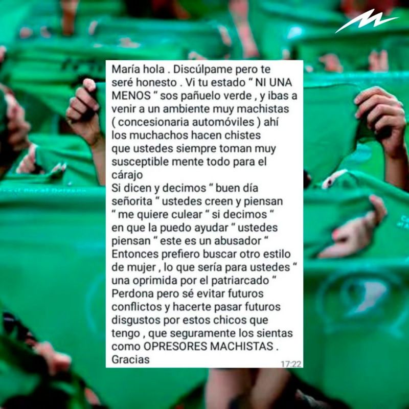 “María, hola. Disculpame, pero te seré honesto. Vi tu estado “Ni una menos”, sos pañuelo verde (sic) e ibas a venir a un ambiente muy machista (concesionaria de autos). Ahí los muchachos hacen chistes que ustedes siempre toman muy susceptiblemente, todo para el carajo”, comienza el mensaje que recibió la mujer.