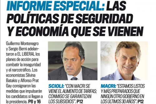 Tiempo de lectura: 1 minuto, 54 segundosGuillermo Montenegro y Sergio Berni adelantaron a EL LIBERAL los planes de acción para combatir la inseguridad y el narcotráfico. Los economistas Silvina Batakis y Alfonso Prat Gay consignaron las medidas que impulsarán los candidatos si llegan a la presidencia.