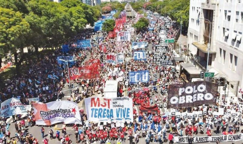 Las columnas de manifestantes, marcharon con el lema “Por trabajo y por salario, contra el hambre y la pobreza”, y protestaron contra de la política socioeconómica del Gobierno nacional en un “plan de lucha” contra lo que consideran un “ajuste”.