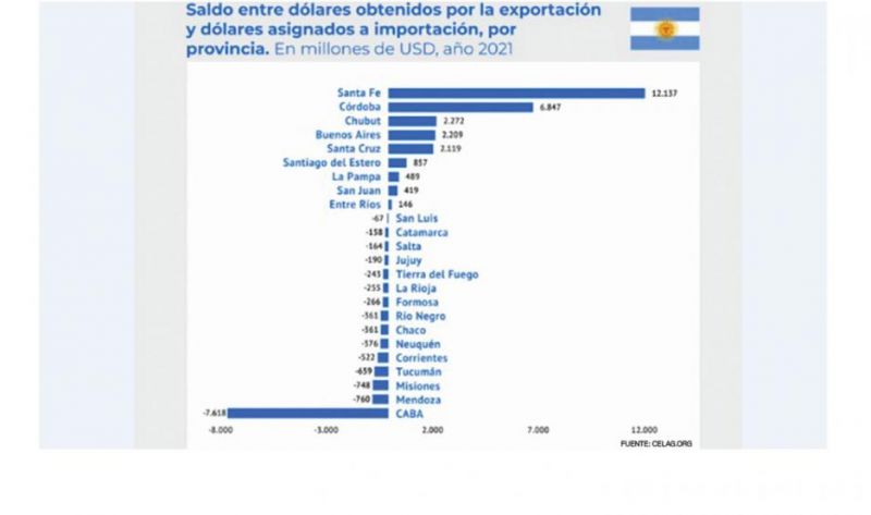 Santa Fe, con 12,1 mil millones de dólares de superávit es la provincia más superavitaria y duplica a la segunda, Córdoba, con 6,8 mil millones de dólares y sextuplica a las tres seguidoras, Chubut, Buenos Aires y Santa Cruz cuyos superávits se ubican en torno a los 2 mil millones de dólares”.