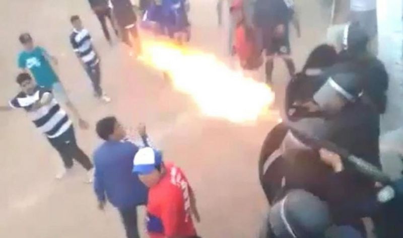 Uno de los efectivos, en pleno caos de violencia, recibió un fuerte golpe en la cabeza que lo derribó de inmediato y el momento quedó registrado en los videos de varios testigos.
