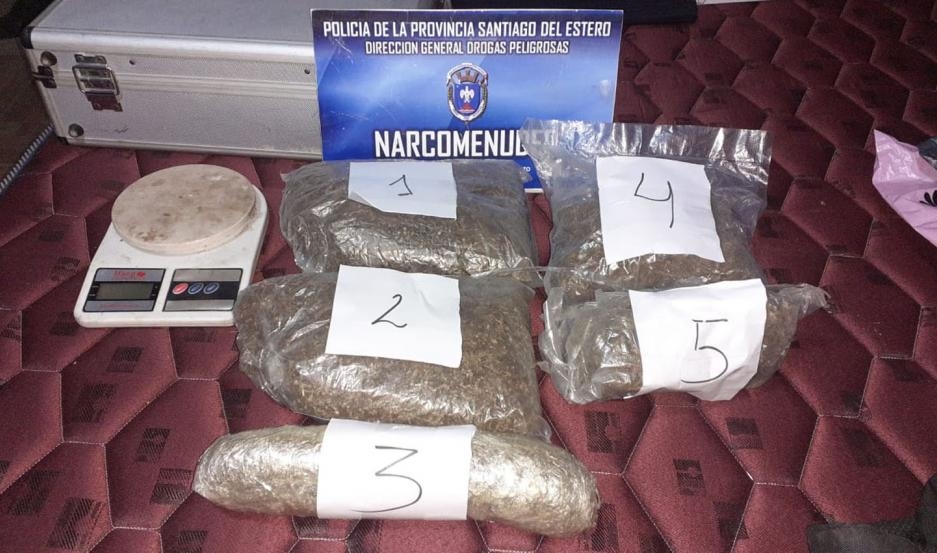 Tras una serie de allanamientos simultáneos, realizados por el Personal de la Dirección General de Drogas Peligrosas, en una habitación de un alquiler y una vivienda particular, de la ciudad de Quimilí, se detectaron siete paquetes de distintos tamaños, que contenían una sustancia vegetal pardoverdosa, al realizar la prueba de campo, arrojo resultados positivos ante la presencia de marihuana con un peso total 2,402 gramos.