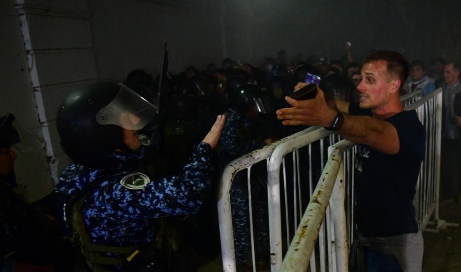 La policía respondió con gases lacrimógenos, que terminaron ingresando al campo de juego y afectaron a jugadores, cuerpo técnico y terna arbitral, además de a los hinchas de las plateas más cercanas a los incidentes. El partido quedó demorado a los diez minutos de juego, con ambos planteles retirándose al vestuario hasta que pase el efecto de los gases. Los incidentes, lejos de cesar, fueron empeorando cada vez más, lo que obligó a Hernán Mastrángelo a suspender el partido a los nueve minutos, con un resultado 0-0 parcial. Se desconoce la cantidad de heridos.