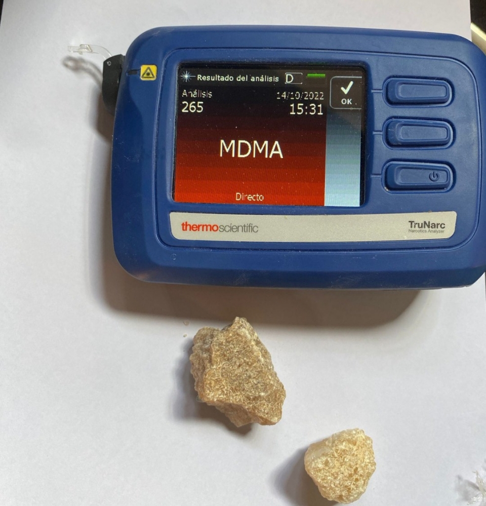 La prueba de campo Narcotest arrojó resultado positivo para MDMA (éxtasis) en pastillas y en forma de cristal con un peso total de 1 kilo 357 gramos.