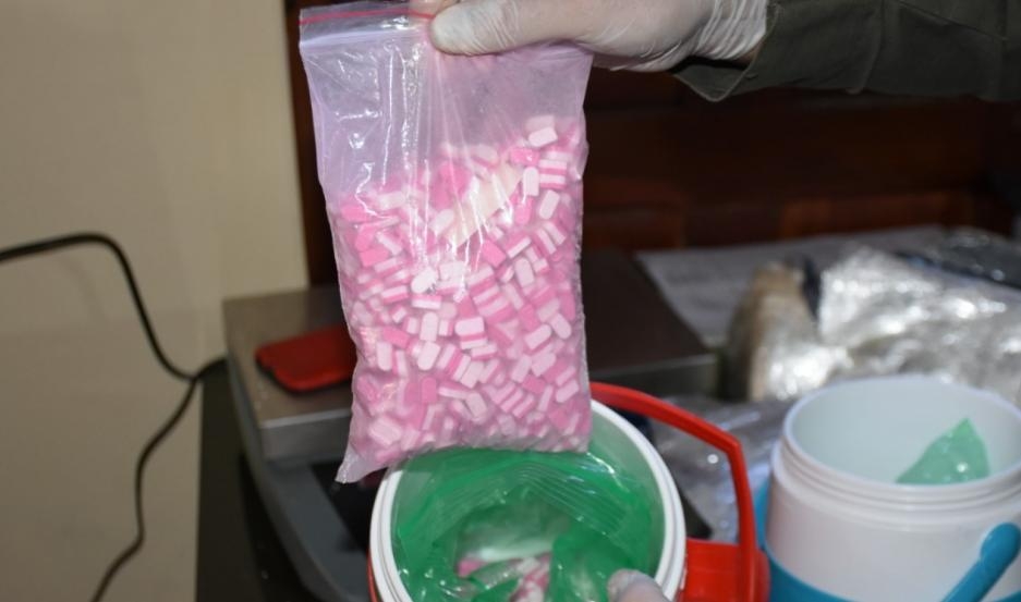 Dentro de uno de los recipientes, había dos bolsas con 1.493 pastillas y en el otro, una bolsa con 513 gramos de una sustancia compacta de color amarillo.
