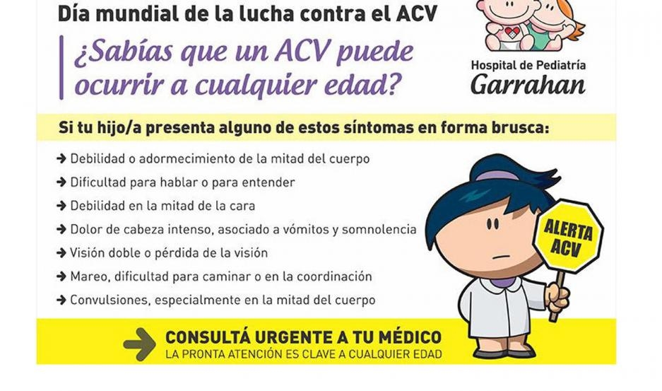 La prevalencia del ACV en niños y niñas es mayor a la de los tumores del sistema nervioso central. Una rápida reacción al detectarla es clave para su pronóstico. El Día Mundial de la lucha contra el ACV (que se conmemoró ayer) fue instaurado por la Organización Mundial de la Salud para concientizar sobre la gravedad de esta enfermedad que también afecta a niños y niñas. Hay señales que pueden ayudar a reconocer un ACV. Entre ellos se encuentran: Debilidad o adormecimiento de la mitad del cuerpo; Dificultad para hablar o para entender; Debilidad en la mitad de la cara; Dolor de cabeza intenso, especialmente asociado a vómitos y somnolencia; Visión doble o pérdida de la visión; Mareo, dificultad para caminar o en la coordinación; y convulsiones. Un accidente cerebrovascular sucede cuando se detiene el flujo de sangre hacia una parte del cerebro y no recibe nutrientes ni oxígeno. Dependiendo del tiempo que pase, las células cerebrales pueden morir y causar daño permanente. Por eso la atención inmediata es tan importante a cualquier edad.