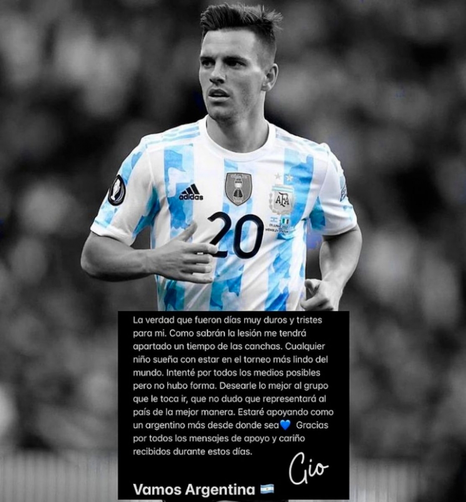 Giovani Lo Celso se volcó a las redes sociales para expresarse después de la lesión que le impedirá jugar el Mundial de Qatar. El mediocampista de 26 años sufrió un pequeño desprendimiento en la inserción del bíceps femoral de la pierna derecha y en consecuencia, la rehabilitación, intervención mediante, supone un período de inactividad de dos meses. Recién podrá volver a jugar en 2023.