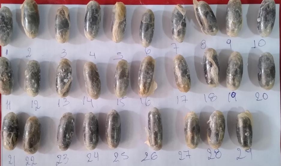 Los gendarmes constataron la presencia de cuerpos extraños en el estómago del pasajero, los cuales totalizaron 98 capsulas que contenían 1 kilo 104 gramos de cocaína.