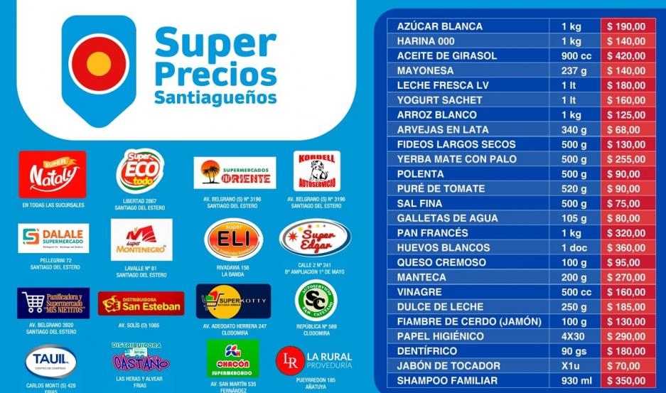 Estos precios cada 15 días van a ser repautados por la Secretaría de Comercio para sostener en el tiempo productos accesibles en los supermercados locales también en los comercios del interior como Añatuya, Fernández, Clodomira, Frías y La Banda”.
