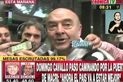 "Macri tiene muy buena gente. Le deseo mucho éxito por el bien de los argentinos", afirmó Cavallo este lunes cuando pasó por el frente del edificio del presidente electo, Mauricio Macri, cuando había montada una guardia periodística en el lugar.