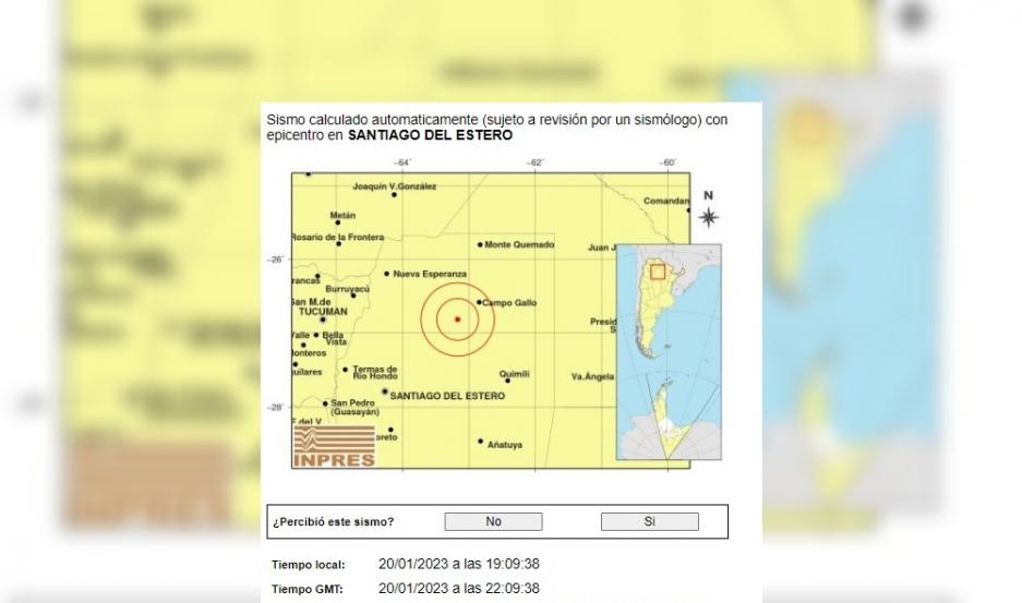 Este viernes 20 de enero, se registró un temblor en la provincia de Santiago del Estero. De acuerdo con datos arrojados por el INPRES, el fenómeno se produjo exactamente a las 19:09.