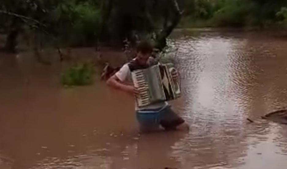 El hombre tomó su instrumento a salió en medio del agua a interpretar tres chamamés en tributo y agradecimiento al cielo por haber bendecido la tierra con la lluvia.