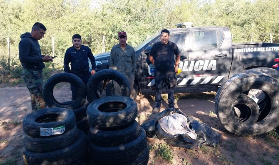 Al recorrer unos metros, descubrieron una carpa de color negra tapada con plantas y en ella un total de (4) Rodado 175-70-13, (6) Rodado 175-65-14, (4) Rodado 185-60-15, (4) Rodado 205-65-15, (2) Rodado 205-55-16, (2) Rodado 225-70-16 y (6) Rodado 275.80R225-18PR, entre algunas otras.