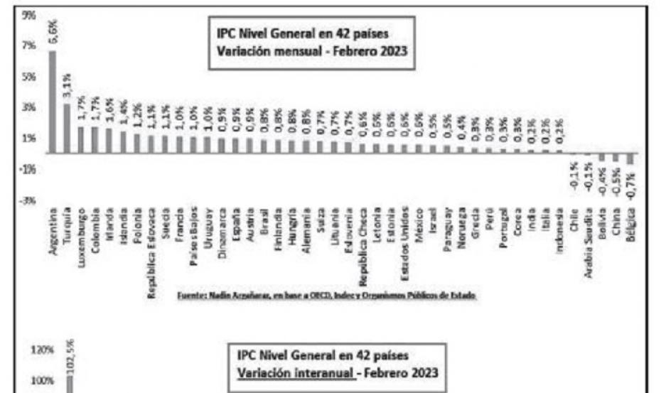 Afirmó además que "considerando la variación interanual de febrero de 2023, en la muestra se destacan Argentina (102,5%) y Turquía (55,2%). Luego sigue un segundo grupo de dos países con inflación superior al 20% interanual (Hungría y Letonia). En el otro extremo, Corea, Luxemburgo, Suiza, Arabia Saudita, Bolivia y China, registraron una inflación interanual inferior al 5%".