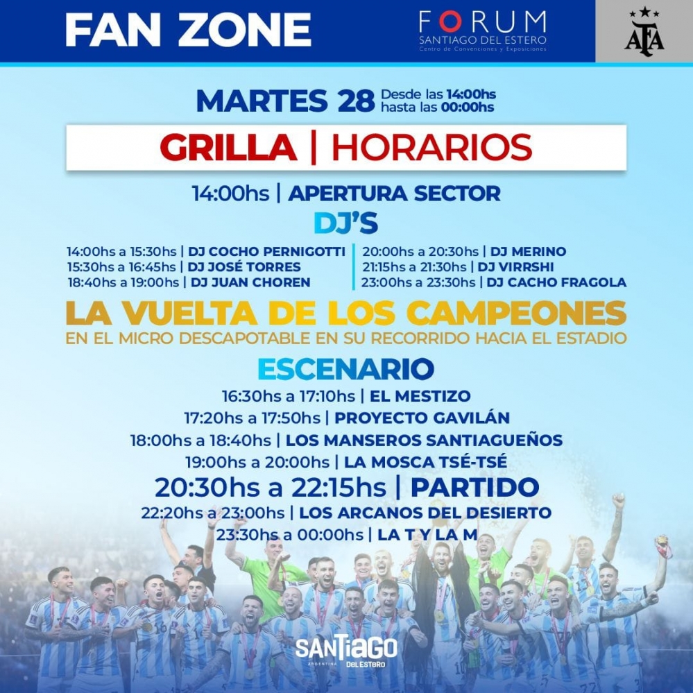 Este martes 28 de marzo es un día histórico para Santiago del Estero, ya que la Selección Argentina, vigente campeón del mundo, disputará un encuentro amistoso con Curazao en el Estadio Único Madre de Ciudades. A continuación la agenda completa con todas las actividades.