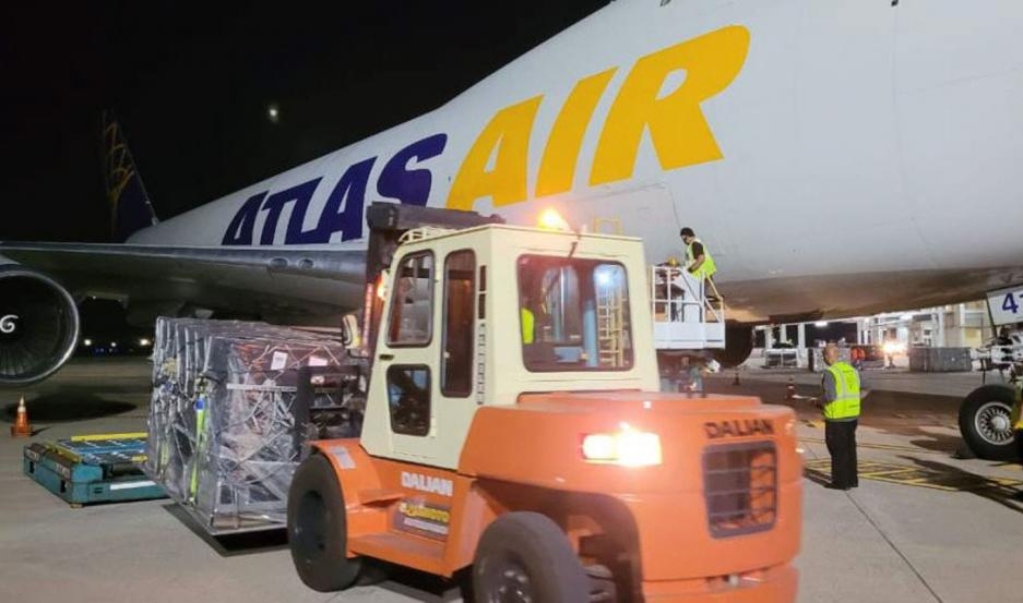 Estos aviones traen los 163 contenedores que totalizan más de 380 toneladas y que requieren más de 40 camiones de carga para trasladarlos desde el Aeropuerto hacia el circuito.