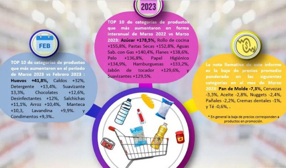En primer término, Focus Market señaló que "en marzo la variación de precios de los Alimentos mantienen aún un nivel elevado en el 7 % aunque descendiendo del 10 % del mes anterior. Por su parte, para el caso de consumo masivo la variación de precios continua siendo elevada. Las subas de precios interanuales de categorías básicas se encuentran en tres dígitos promedio respecto de marzo 2022. Bebidas aumentó 112 %, Limpieza 103 y Cuidado Personal 136,7 % en promedio" detalló Damián Di Pace director de la consultora.