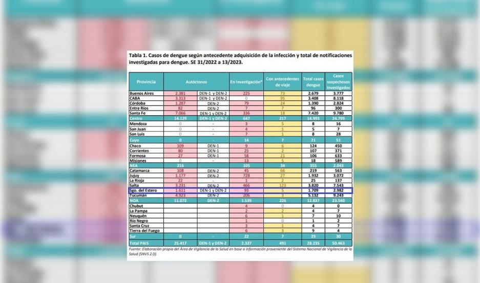 En el Boletín Epidemiológico del Ministerio de Salud de la Nación de la semana 13 (hasta el 2 de abril), se muestra un crecimiento sostenido de los casos de dengue. Con relación a Santiago del Estero, se refleja que desde el 19 de marzo al 2 de abril, se pasaron de 1.148 casos confirmados (según boletín de la semana 12) a 1.709 (boletín de la semana 13); y de 1.957 sospechosos bajo investigación a 2.982. Ello arroja en promedio, un incremento de 50% en dos semanas.