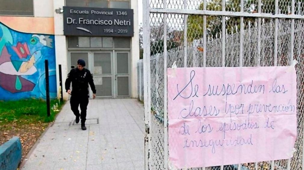"Se suspenden las clases por prevención de los episodios de inseguridad", indica un cartel dejado esta mañana en la puerta la Escuela N° 1346 Dr. Francisco Netri, ubicada sobre la calle Ayala Gauna 8049, y del Jardín N° 79 Pedacito de Patria, que está al lado.