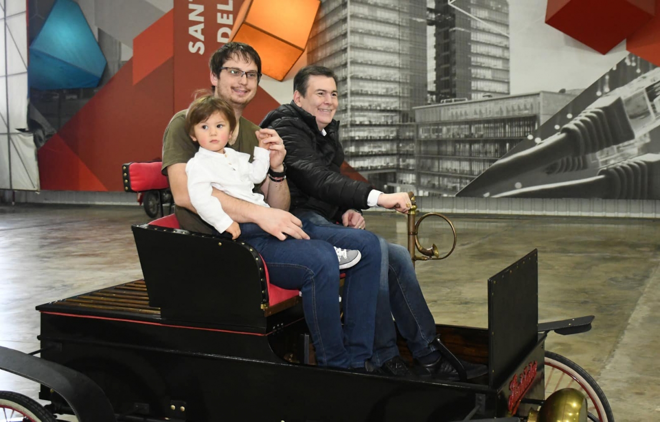 El mandatario recorrió la Expo a bordo del primer auto eléctrico de la Argentina del año 1.902 Marca Studebaker.