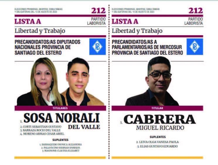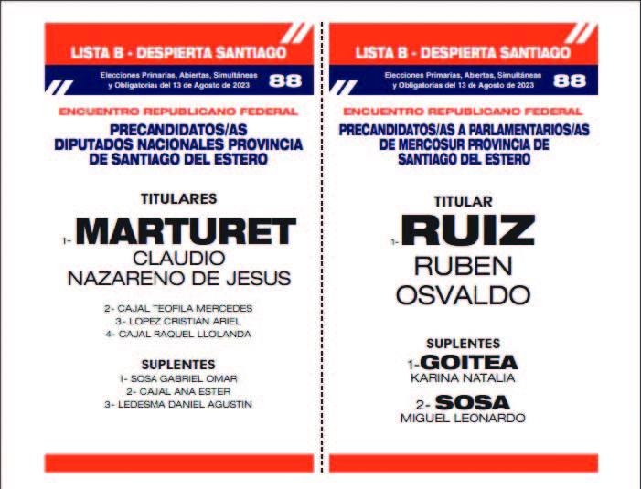 En Santiago del Estero habrá 21 listas que presentan precandidatos a diputados nacionales y a parlamentario del Mercosur (distrito único). En algunos casos, adhieren a fórmulas presidenciales (boleta larga de 4 cuerpos) y en otros casos, será boleta corta (sin precandidatos a presidente y vice ni parlamentarios del Mercosur distrito nacional).