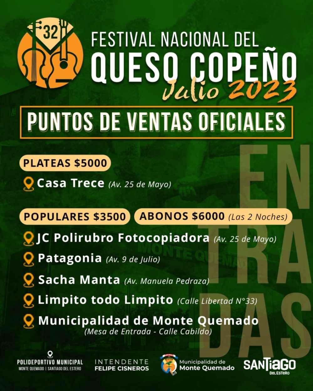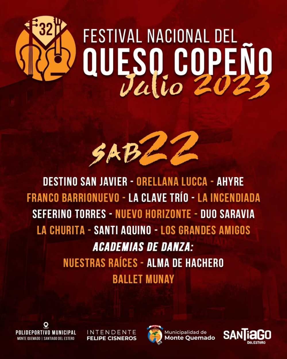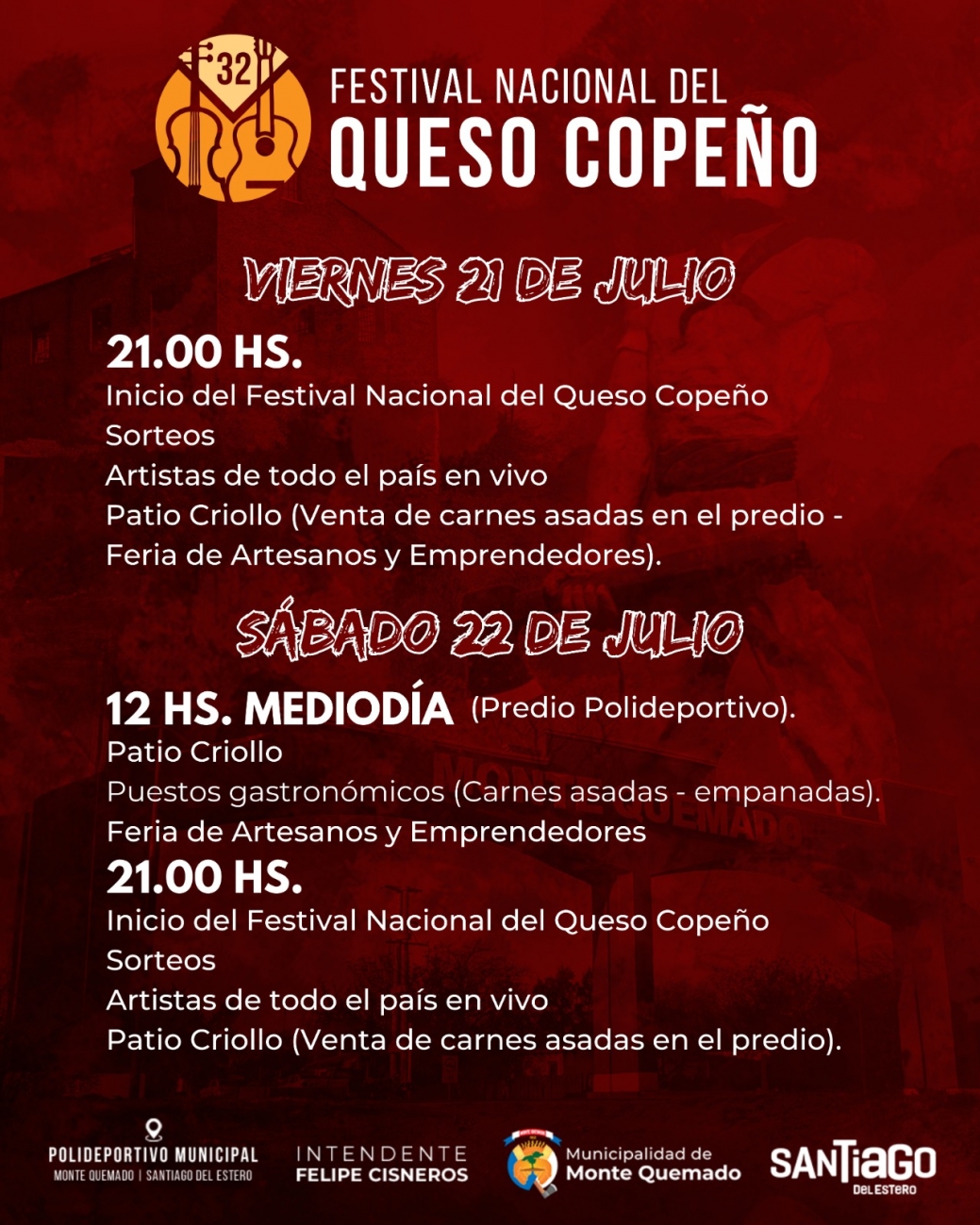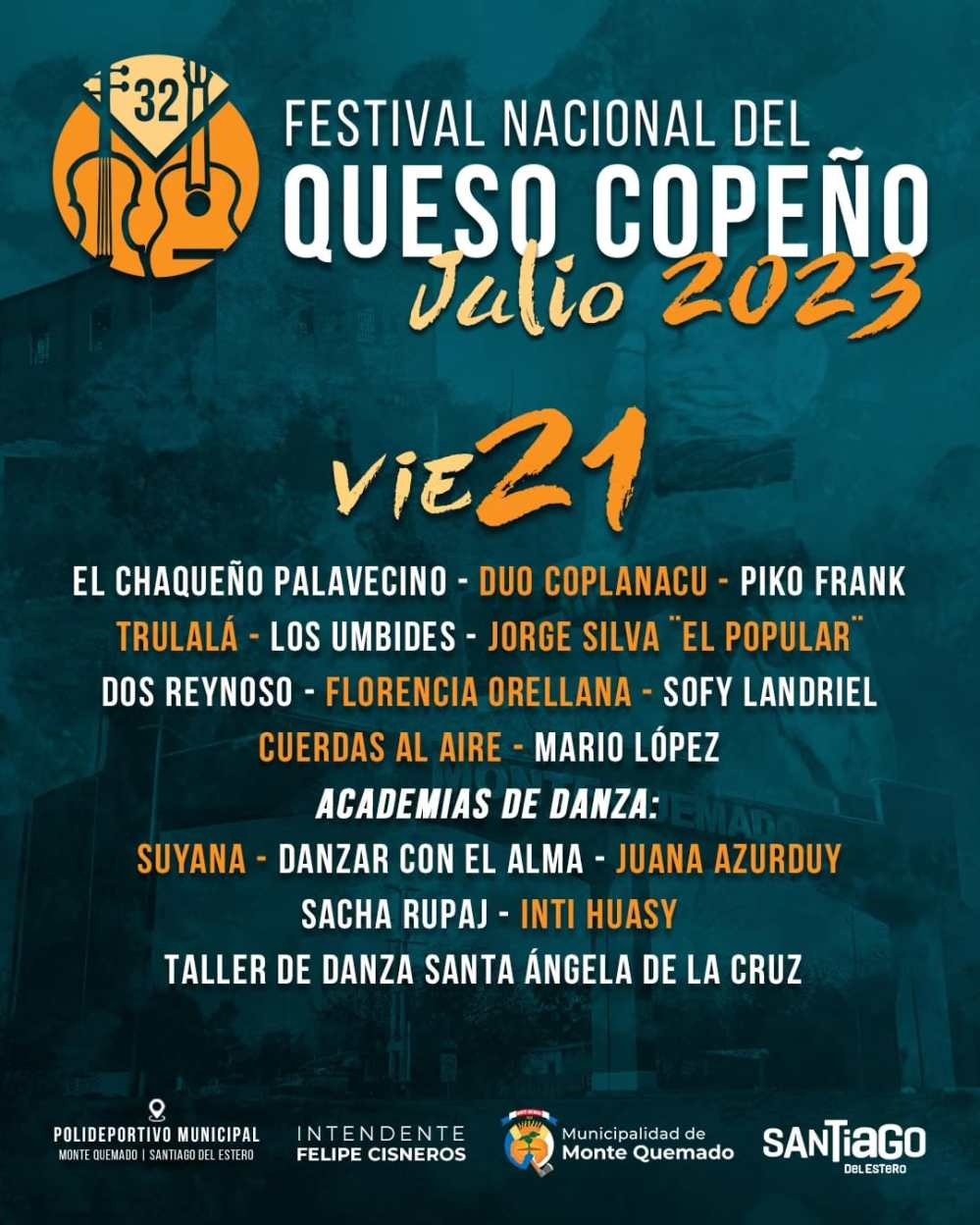 En el marco de los festejos de Santiago, el interior presenta una serie de espectáculos en adhesión a este evento y en un abanico de festivales que engalanan a nuestra provincia está el Festival Nacional del Queso Copeño, que desde hace años paso a ser organizado por la municipalidad local y pudo recuperar el brillo y la importancia que en otros tiempos fuera parte en el concierto nacional en lo que a festivales folclóricos se refiere.
