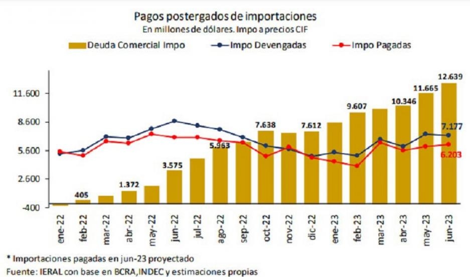 Puntualizó que "la referencia a 2019 es porque la cuenta corriente del balance de pagos fue relativamente equilibrada ese año. Pero el 2023 sólo puede cerrar con un fuerte aumento del endeudamiento externo, del orden de los U$S 15 mil millones, sumando compromisos con China (yuanes) y con proveedores de importaciones compradas "a crédito", que ya generó un pasivo a pagar de unos U$S 12.600 millones desde principios de 2022".