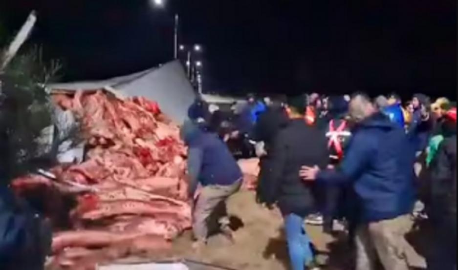 Un camión Mercedes Benz cargado con carne volcó esta madrugada en la Autopista de las Serranías Puntanas a la altura de la localidad de Fraga y vecinos alertados sobre lo ocurrido se llevaron parte de la carga.