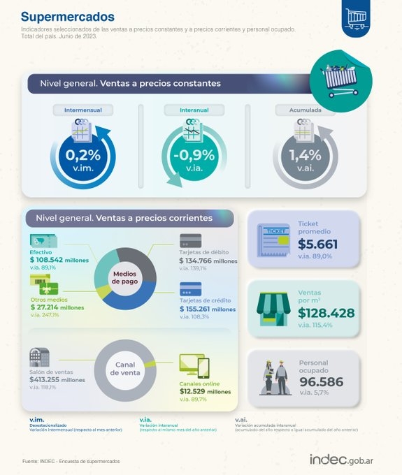 El Instituto Nacional de Estadísticas y Censos (Indec) informó que las ventas en los supermercados durante el mes de junio cayeron 0,9% en relación a igual mes de 2022. A su vez, en los shopping, las ventas subieron 11,8% y en los autoservicios mayoristas un 2,8%, en igual período.