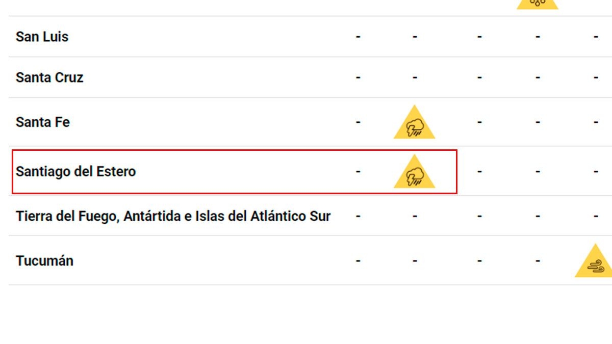 Santiago del Estero, al igual que otras provincias, se encuentra bajo alerta meteorológica la que fue emitida por el Servicio Meteorológico Nacional por tormentas. La alerta estará vigente hasta el mediodía del lunes, salvo que se notifique un cambio dadas las condiciones y sea necesario levantar la alerta.