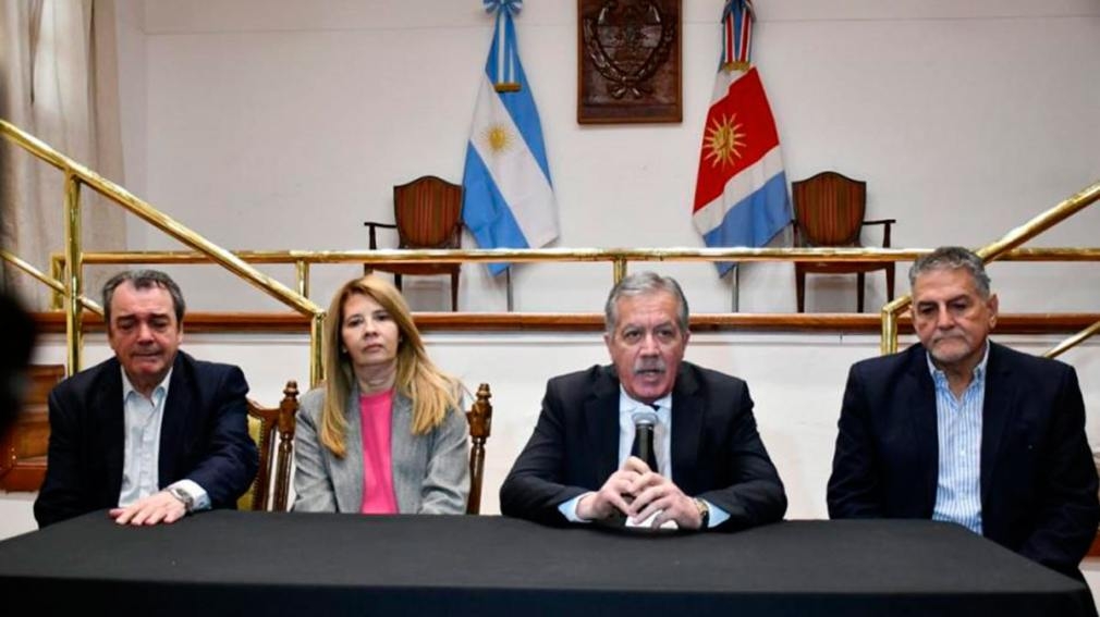 En Casa de Gobierno, se realizó este lunes una conferencia de prensa encabezada por el jefe de Gabinete de Ministros, Elías Súarez, quien estuvo acompañado por los ministros de Justicia y DDHH, Matilde O'Mill; de Desarrollo Social, Ángel Niccolai, y el titular de Enrese, Luis Orlando Cabanillas.