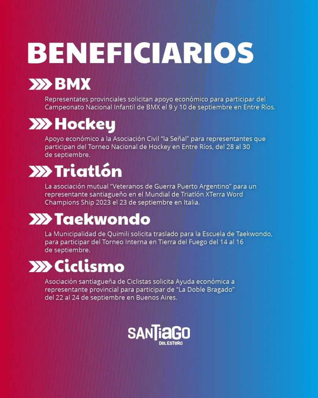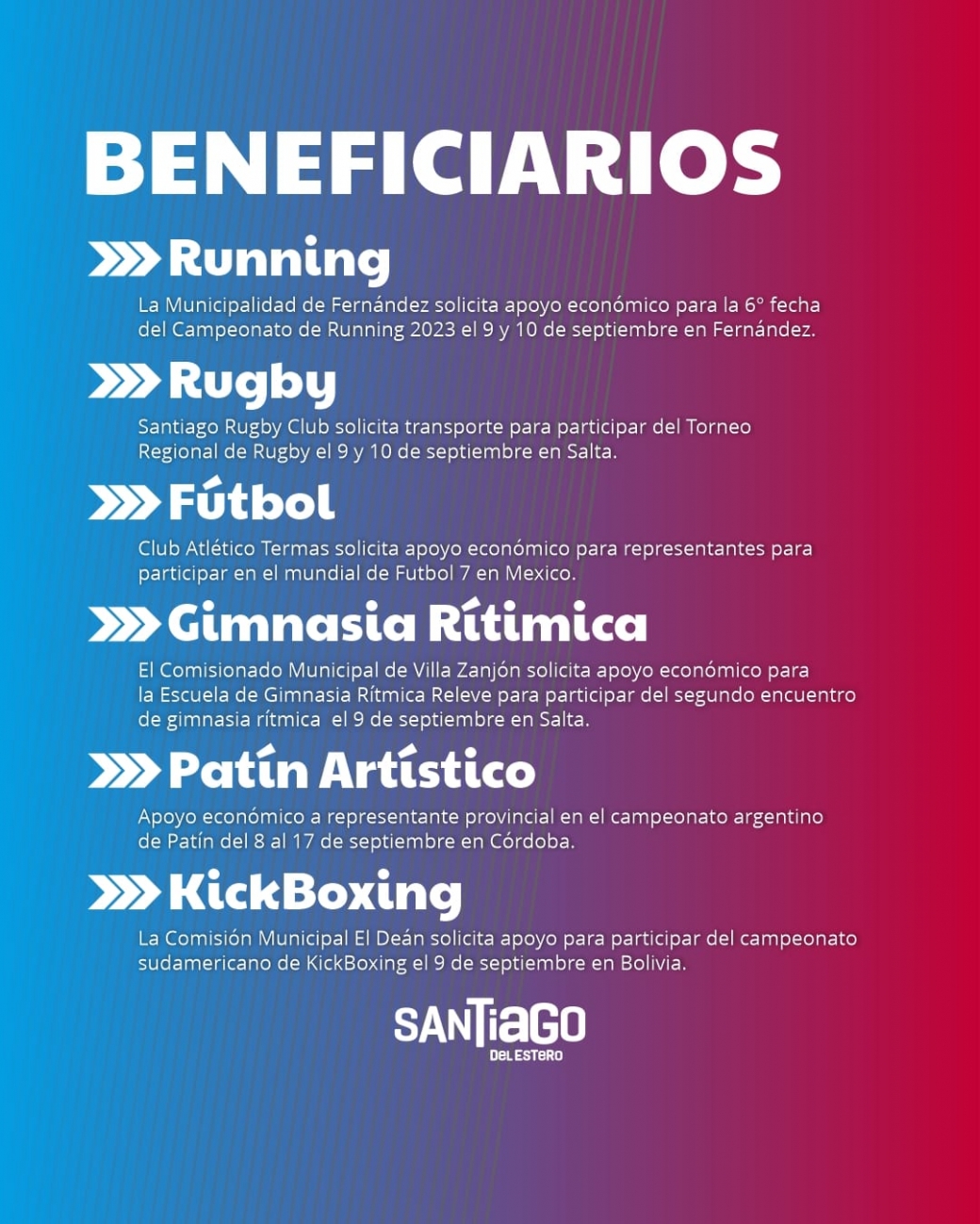 Durante el mes de Septiembre se brindó ayuda económica y traslados a distintas instituciones y representantes deportivos de las diferentes disciplinas que compiten en nuestra provincia.