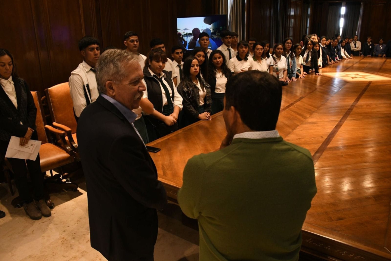 Tiempo de lectura: 25 segundosEl Jefe de Gabinete de Ministros, Elías Suárez, recibió en #CasaDeGobierno a una delegación de 70 alumnos del Agrupamiento N° 86.036 de la localidad El Arenal, departamento Jimenez; del secundario de Las Delicias, Pellegerini, y del Agrupamiento N° 86.104 de El Favorito, Banda.