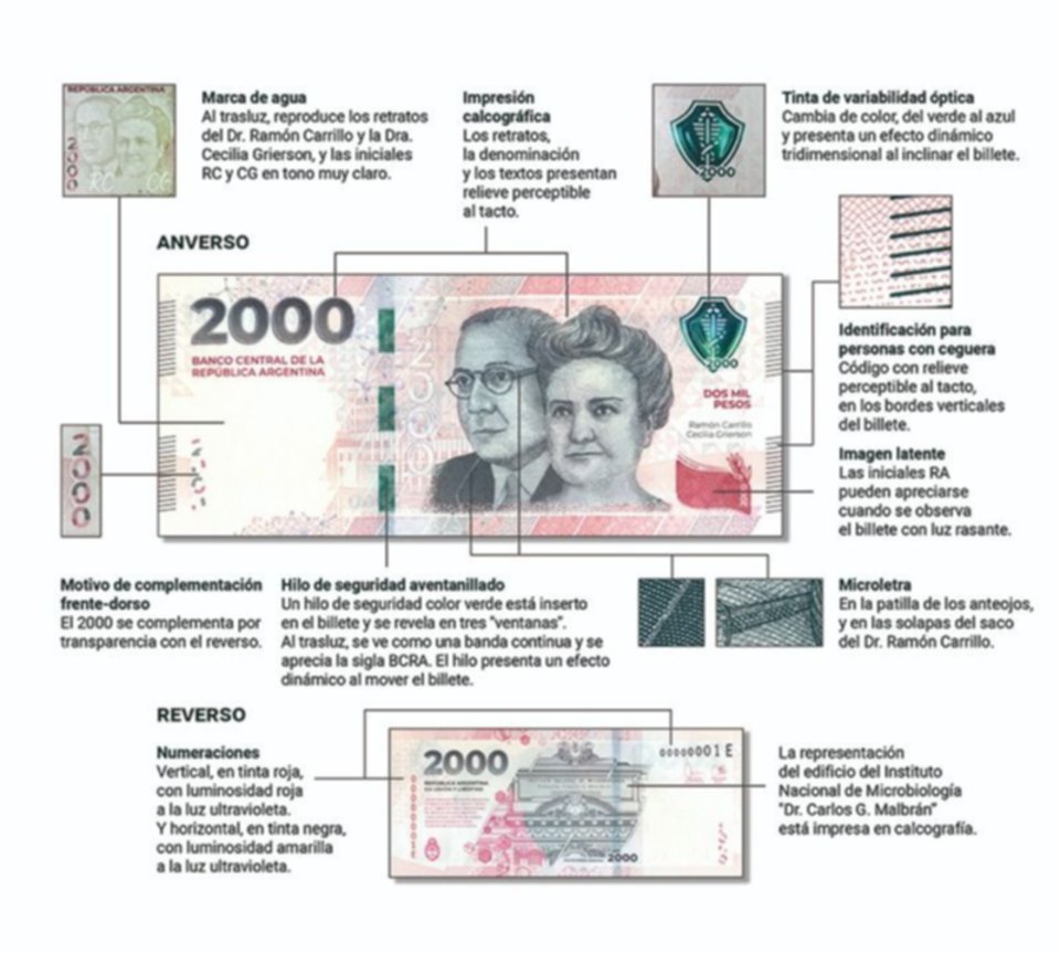 Diseñado en colaboración con Casa de Moneda Argentina, el billete de 2.000 pesos cuenta, entre otras, con las siguientes medidas de seguridad: