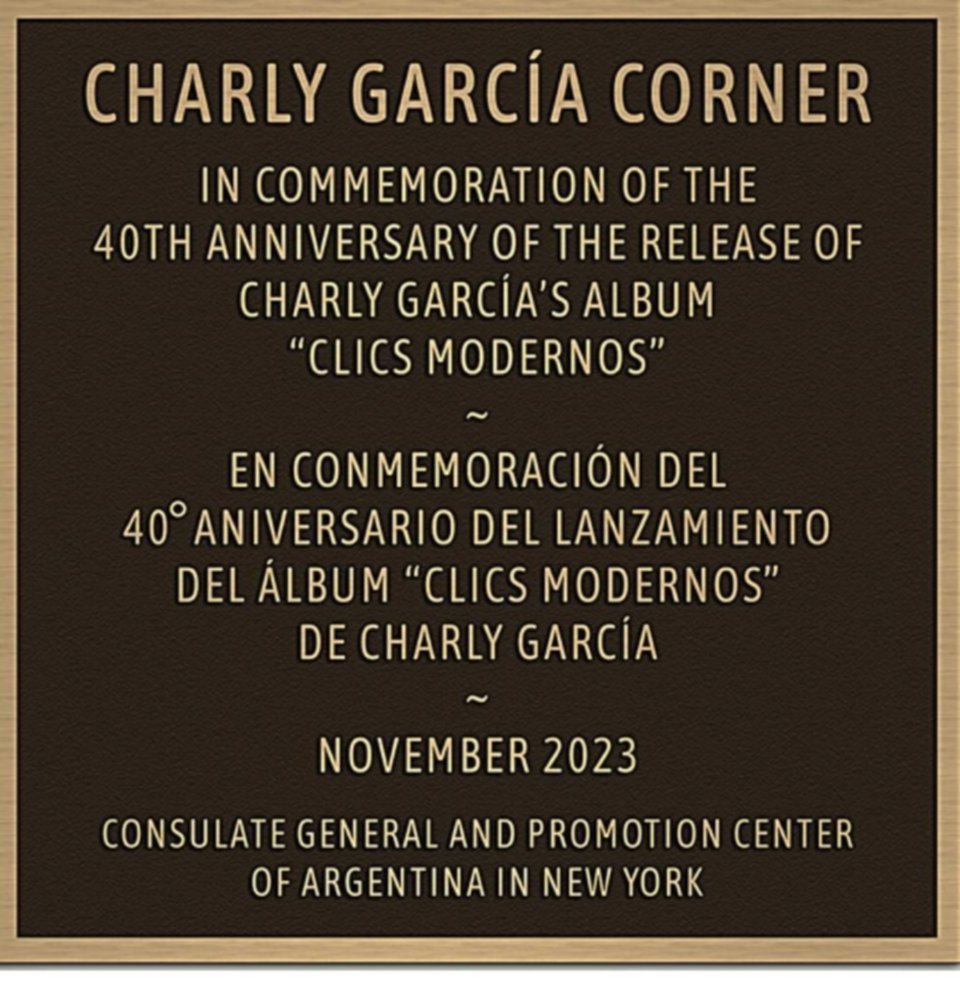 La Ciudad de Nueva York inauguró hoy, en el cruce de las calles Walker St. y Cortlandt Alley, la “Esquina Charly García” (Charly García Corner), en homenaje al 40º aniversario del lanzamiento del álbum Clics modernos y en el lugar exacto donde fue tomada la icónica imagen que constituye el arte de tapa del disco.