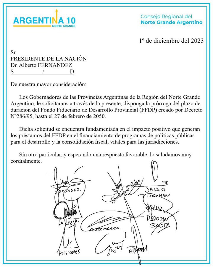 El gobernador Gerardo Zamora, a través de sus redes sociales, dio a conocer la nota que los mandatarios le presentaron a Fernández, en la cual se afirma que los mandatarios "de las provincias argentinas de la región del norte grande argentino, le solicitamos disponga la prórroga del plazo de duración del Fondo Fiduciario de Desarrollo Provincial (FFDP) creado por Decreto Nº286/95, hasta el 27 de febrero de 2050".