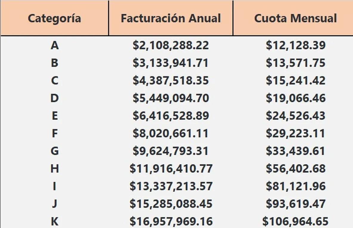 De este modo, los contribuyentes de la categoría más baja (A) podrán facturar hasta $2.108.000 anuales con una cuota mensual de $12.128,39; y los de la categoría K, que es la más alta, tendrá cuotas mensuales de $107.000 con ingresos de hasta $16,957,969.16 al año.