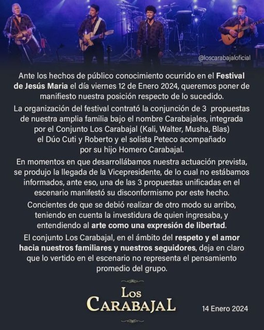 "En el escenario hubo tres propuestas de nuestra amplia familia bajo el nombre Carabajales -Los Carabajal, el Dúo Cuti y Roberto y Peteco acompañado de su hijo Homero-, en momentos del arrbo de la Vicepresidente, del cual no estabamos informados, una de las tres propuiestas manifestó su disconformidad con lo sucedido", reza el comunicado.